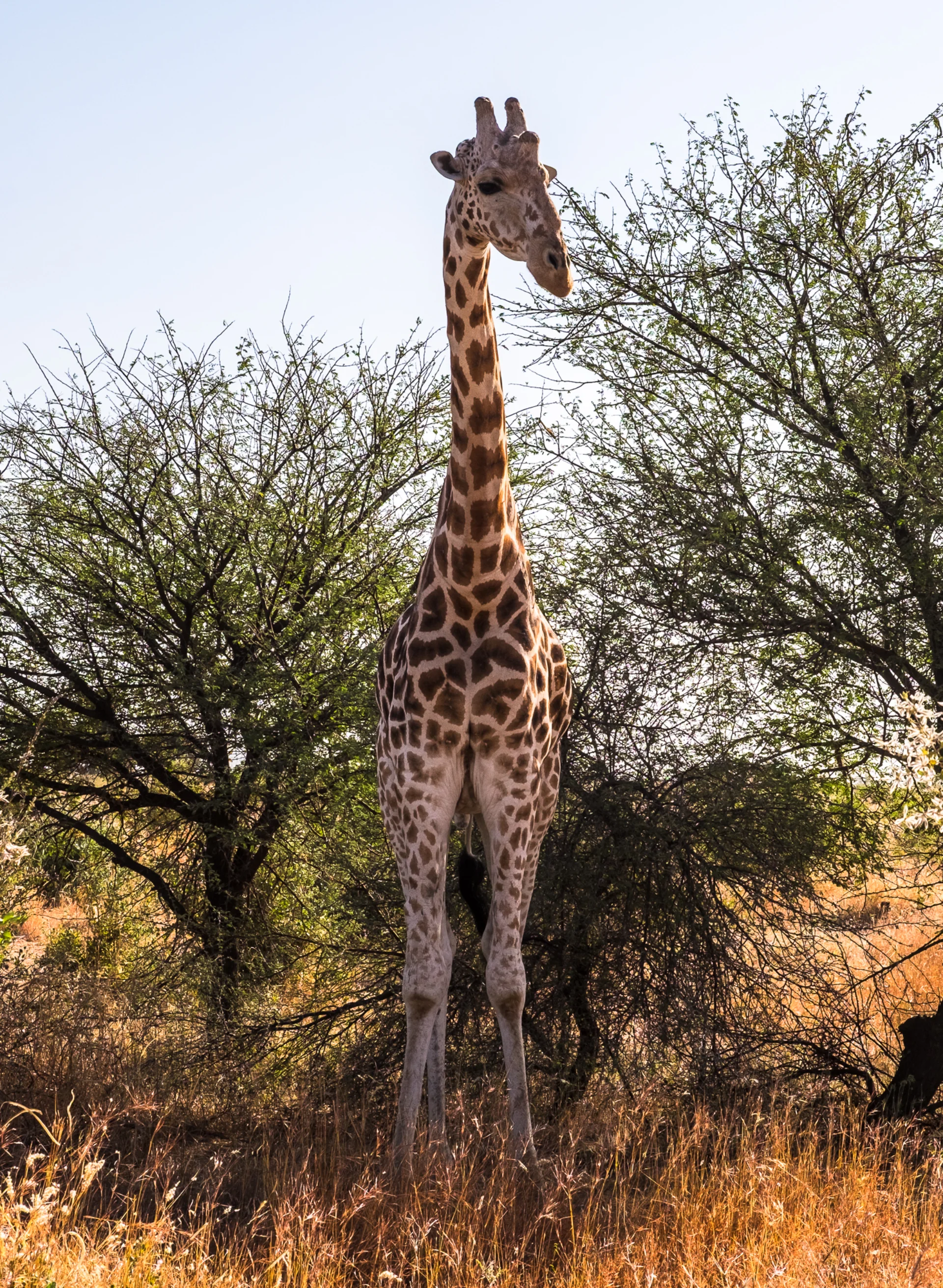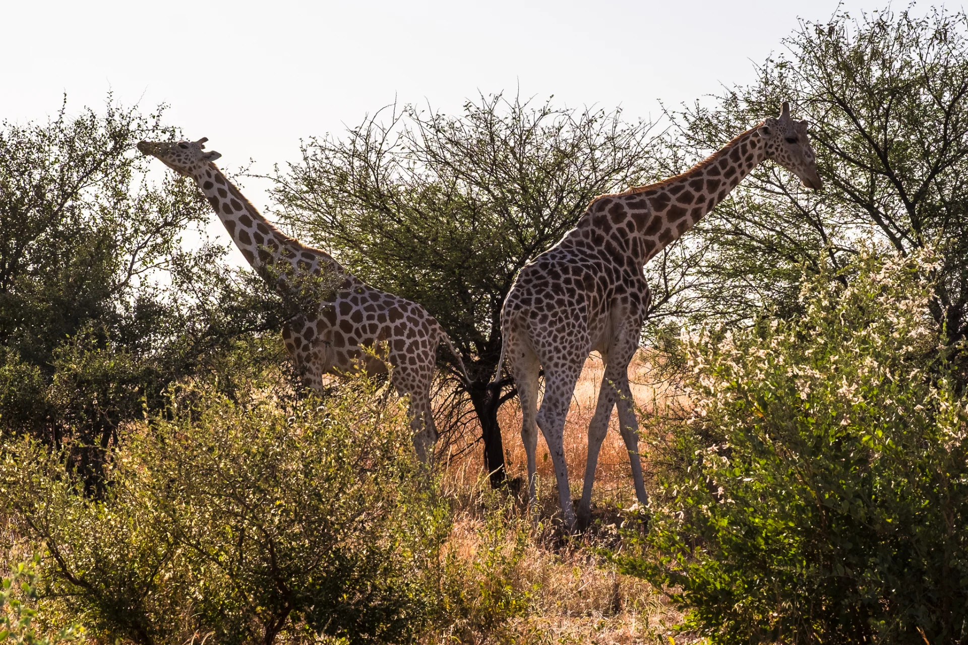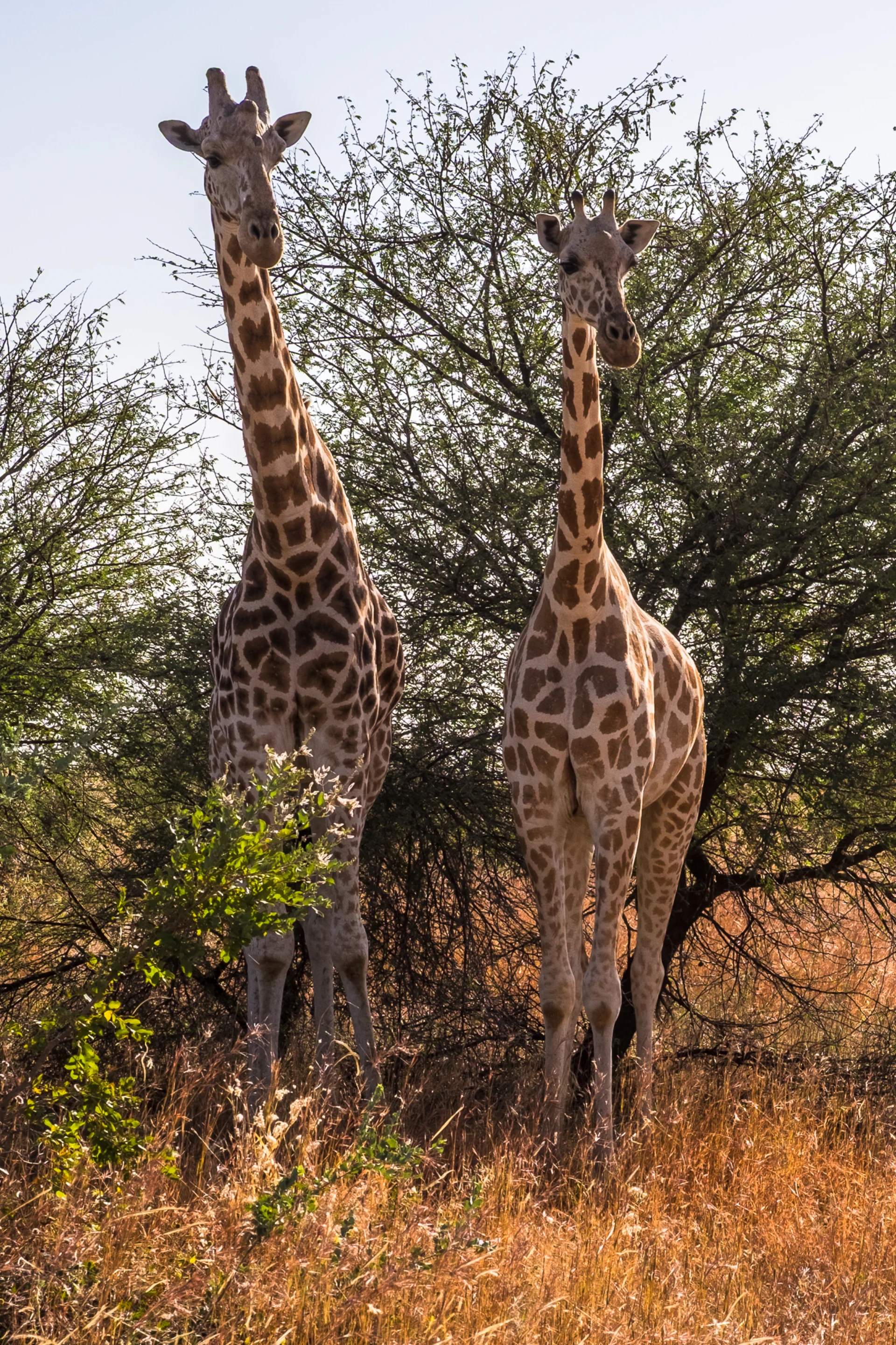 On trouve la première famille de girafe. Elles sont très difficile à localiser. Je demande à m’arrêter assez loin. Je dois aller de l’autre côté du troupeau, pour avoir la lumière dans le bon sens. Et oui, je photographie presque tout le temps en contre-jour ! En marchant lentement, j’amorce le contact avec les girafes, qui m’observent de loin. J’adopte des gestes lents, le regard direct mais sans le soutenir trop, je fais le tour en me rapprochant peu à peu. Elles ne bougent pas et broutent tranquillement les acacias.