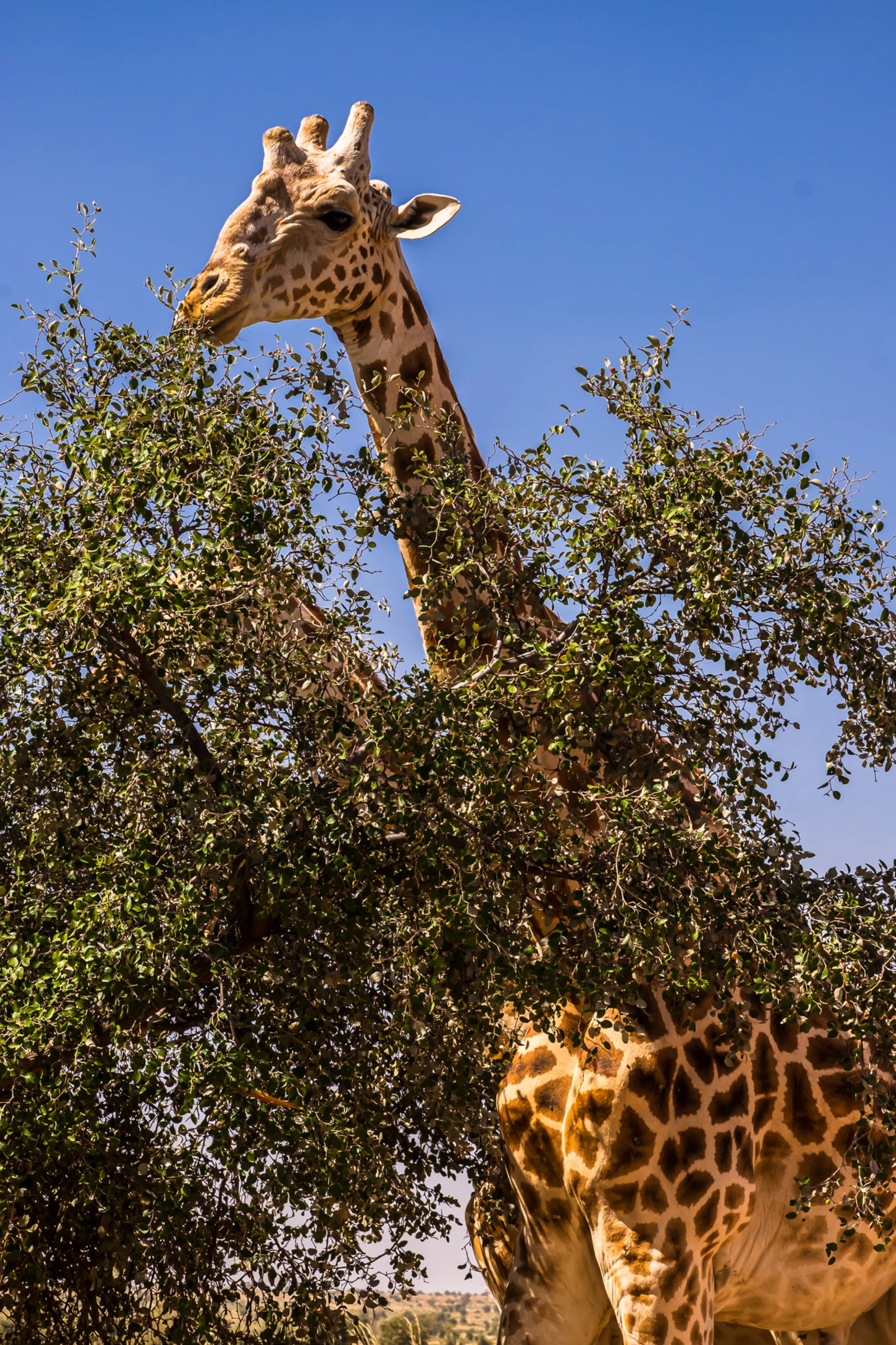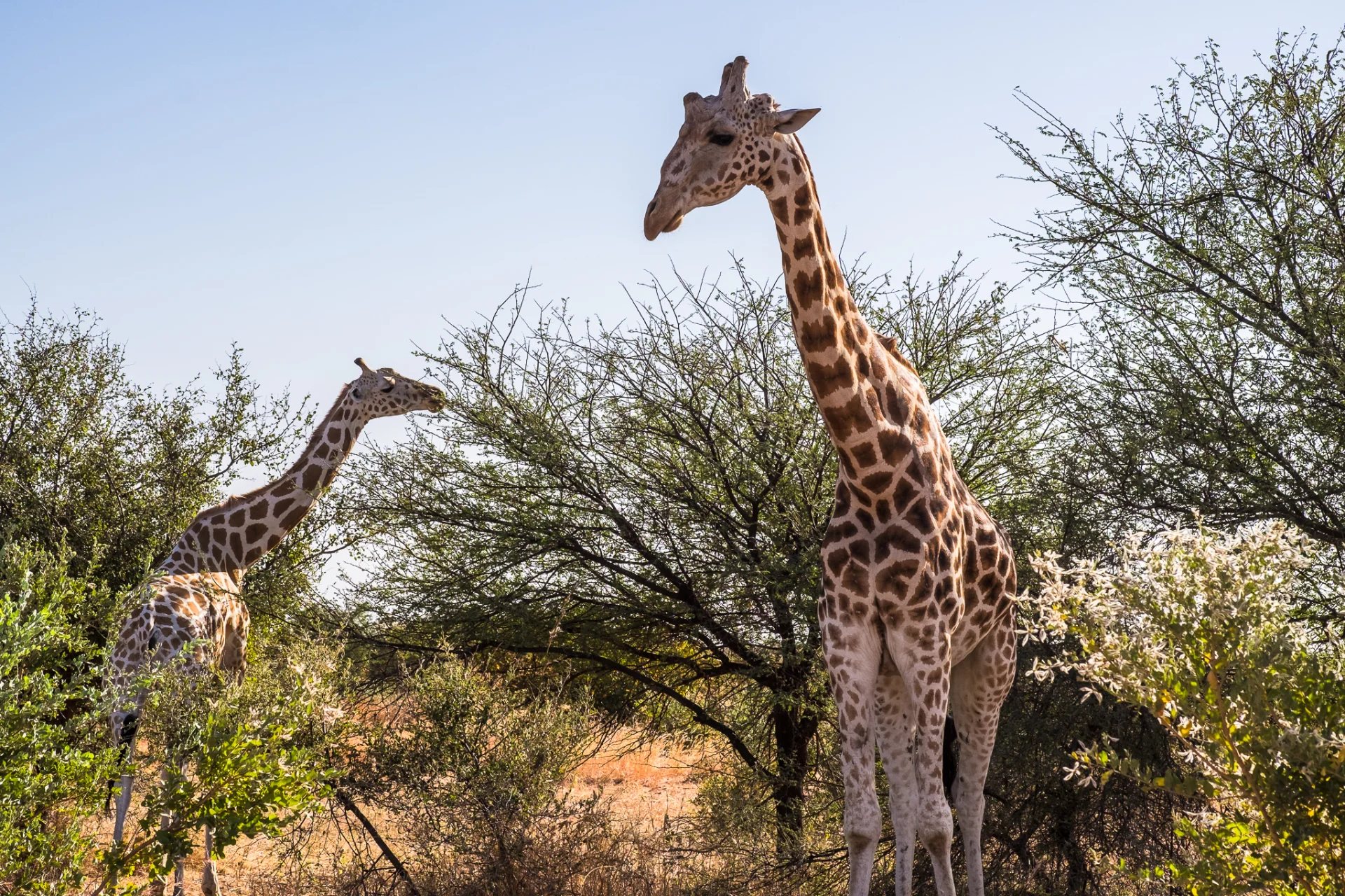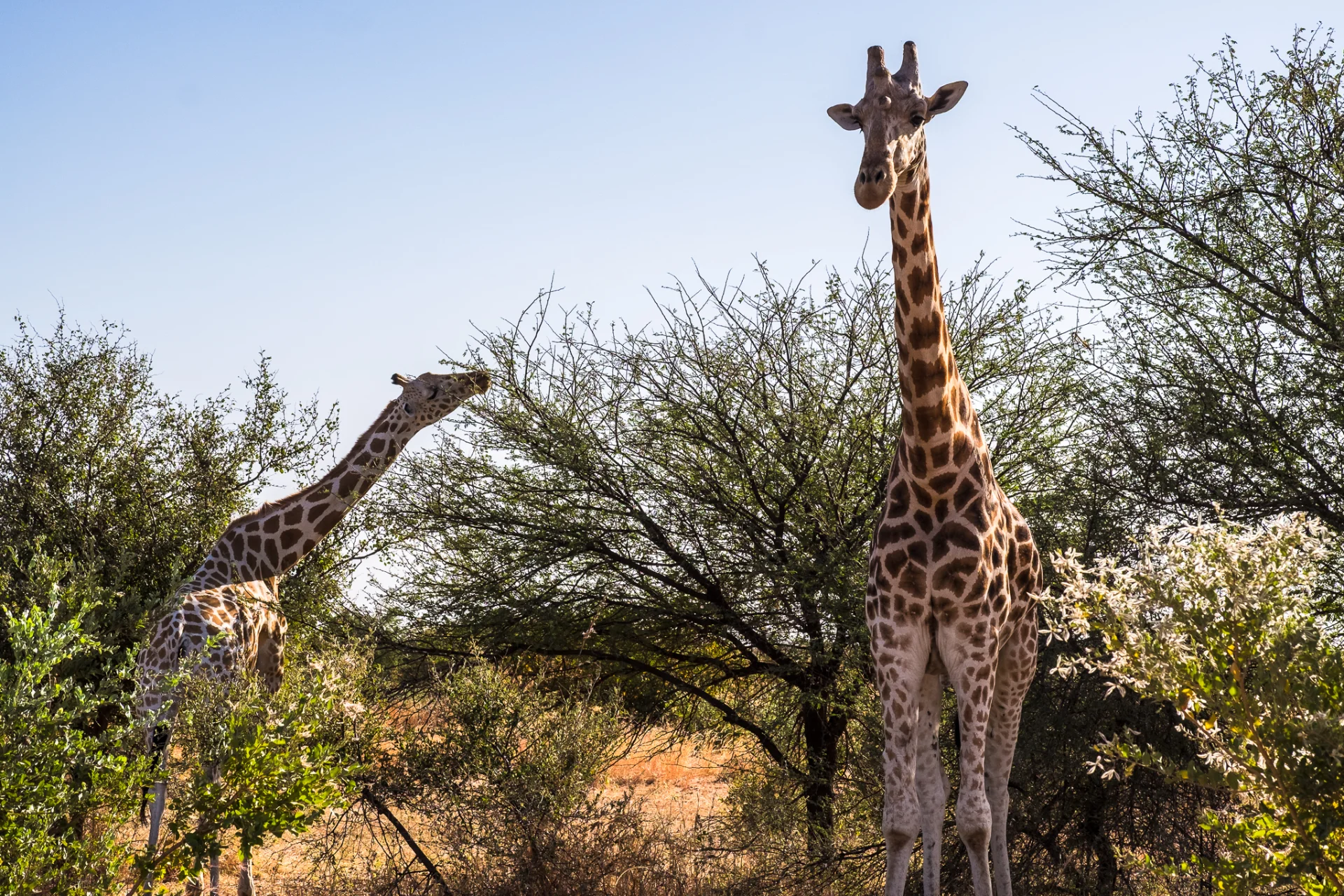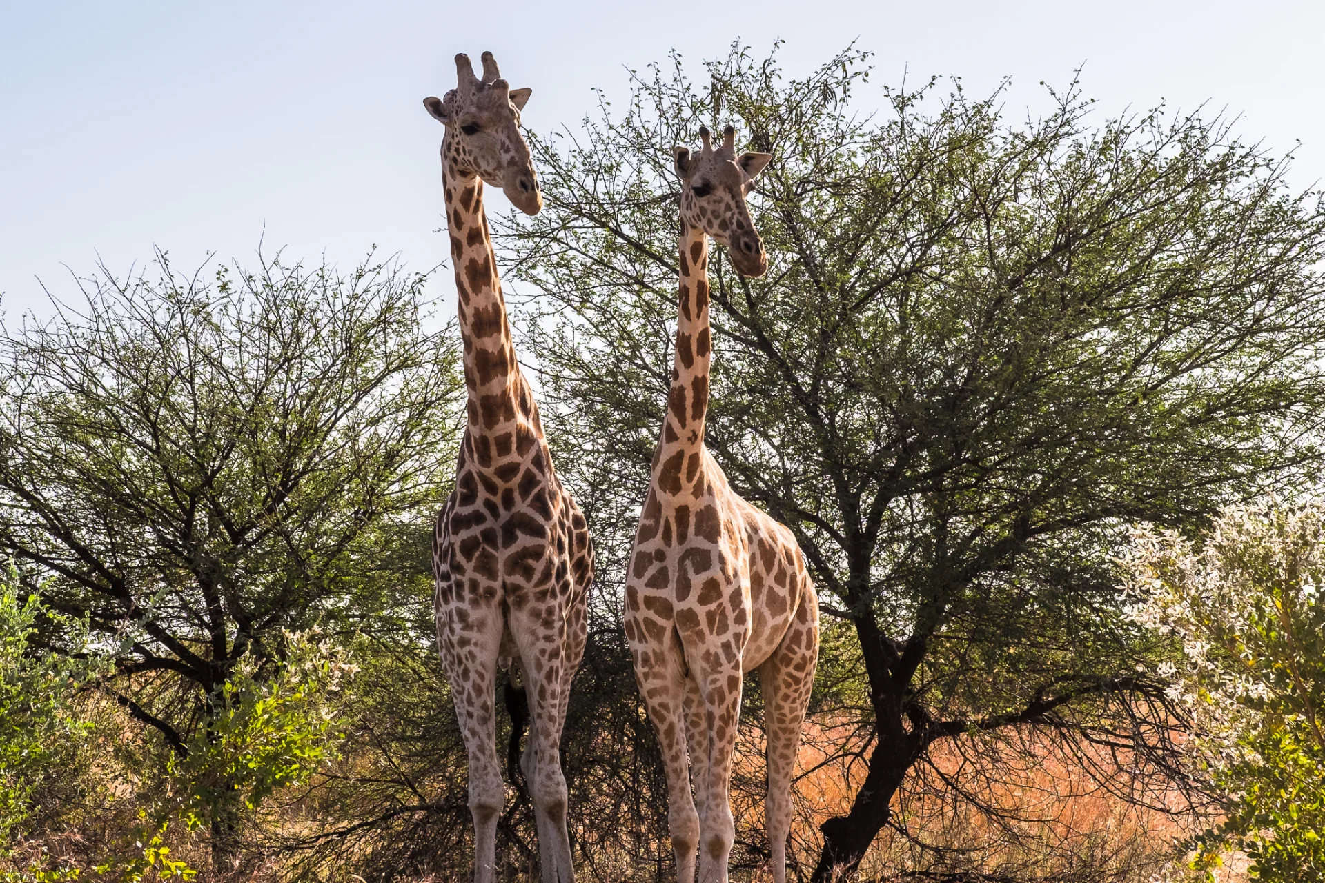 On trouve la première famille de girafe. Elles sont très difficile à localiser. Je demande à m’arrêter assez loin. Je dois aller de l’autre côté du troupeau, pour avoir la lumière dans le bon sens. Et oui, je photographie presque tout le temps en contre-jour ! En marchant lentement, j’amorce le contact avec les girafes, qui m’observent de loin. J’adopte des gestes lents, le regard direct mais sans le soutenir trop, je fais le tour en me rapprochant peu à peu. Elles ne bougent pas et broutent tranquillement les acacias.