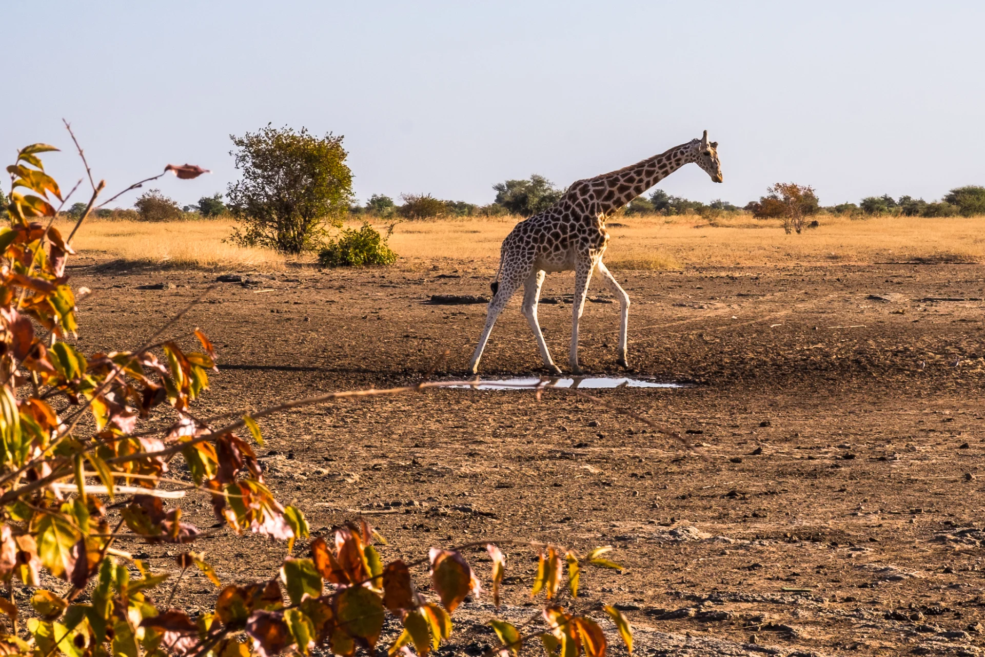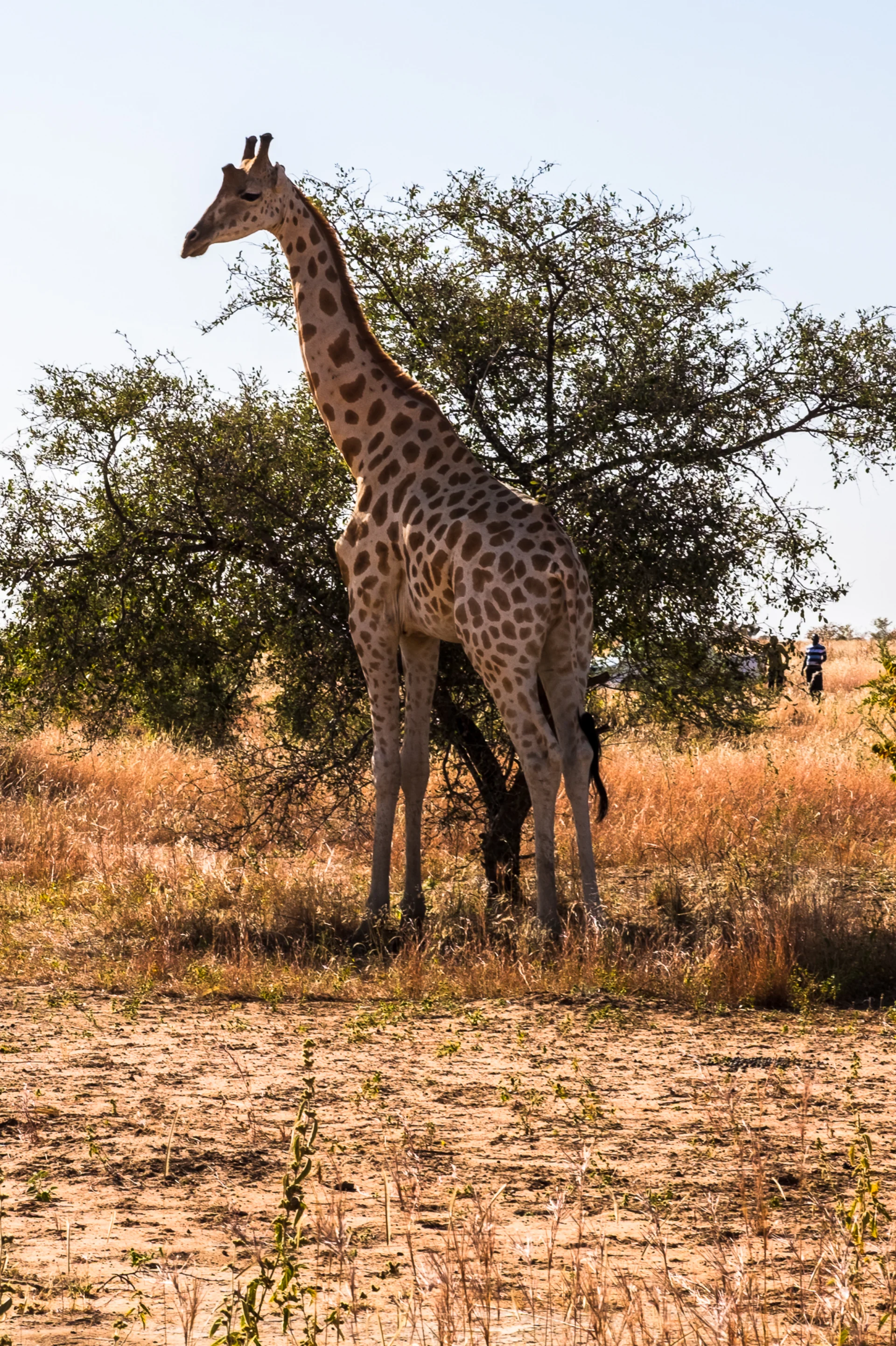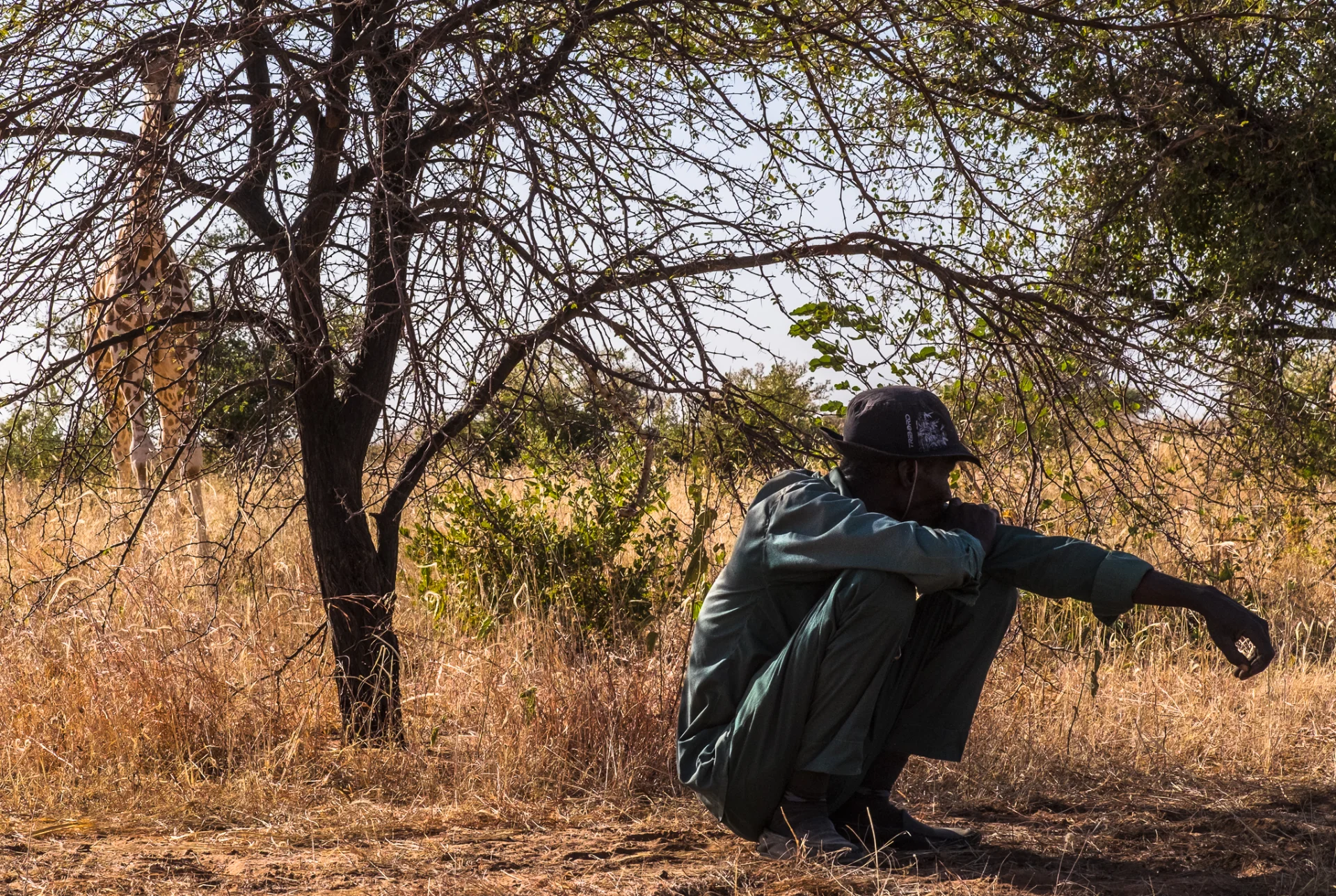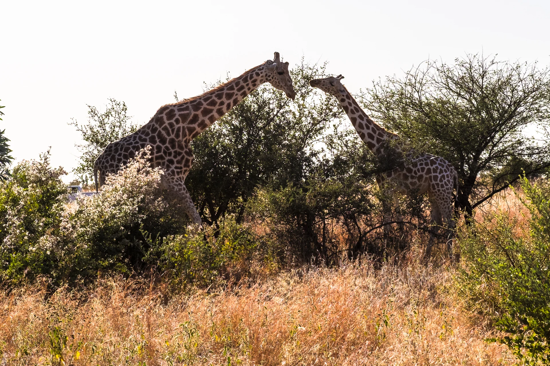 Je fais quelques photos enfin. Puis arrive face à moi un minibus, assez (trop) rapidement. 8 personnes en sortent, avec pieds, sacs, déguisements de reporteur et s’installent à grand bruit : des amateurs qui se prennent pour des pros en safari. Pas fan. Les girafes n’apprécient pas non plus et partent. Mais, même si elles paraissent bouger lentement, elles se déplacent rapidement, et on les perd bien-sûr ! Merci la foule ! Le guide me dit qu’il faudra 2 à 3 heures pour les retrouver ! C’est malin.
