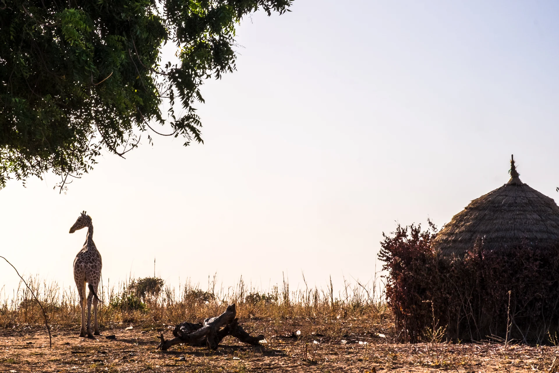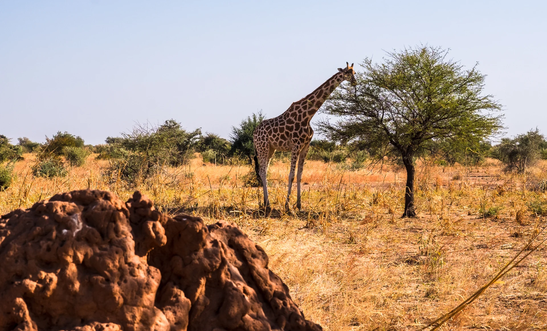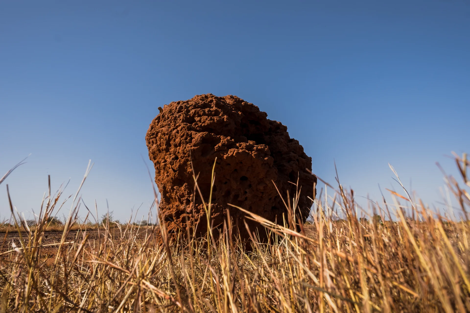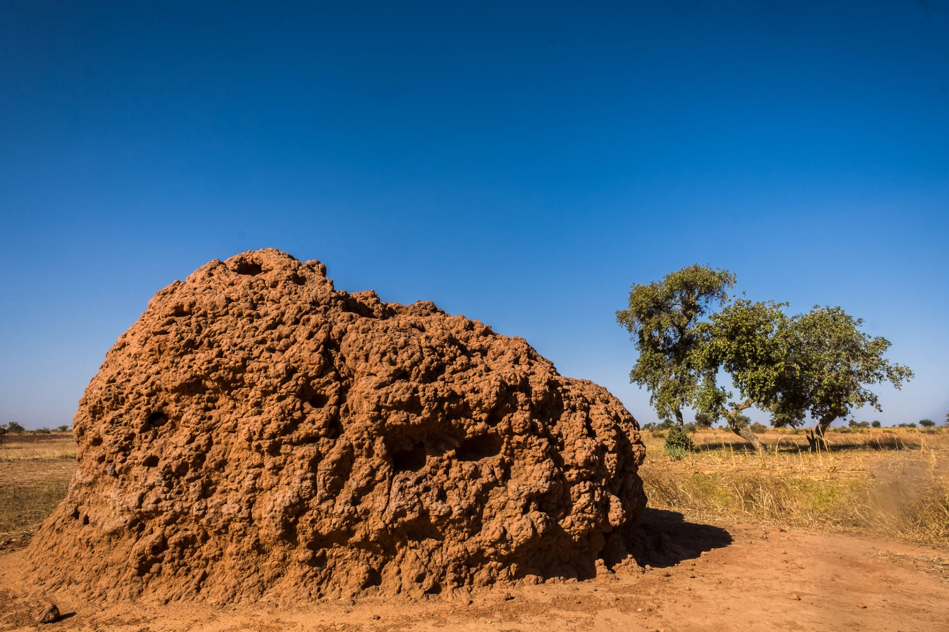 Je découvre enfin ce que l’on appelle le « petit soir ». C’est quand le soleil est couché, la période avant le nuit. Dans certaines régions d’Afrique, le petit soir dure longtemps. Ça a été le cas. La lumière était sublime : chaude, feutrée, enveloppante, cuivrée, sanguine. Tout changeait. Les paysages reprenaient vie. On termine la journée avec quelques termitières géantes (3m de haut), mais sans voir les termites.
